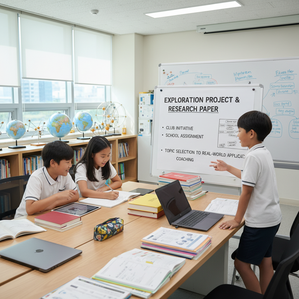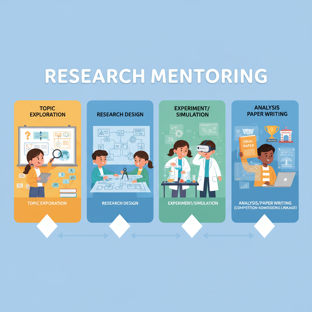주제 탐색 → 연구 설계 → 실험/시뮬 → 분석/소논문 작성(경진대회·입시 연계)